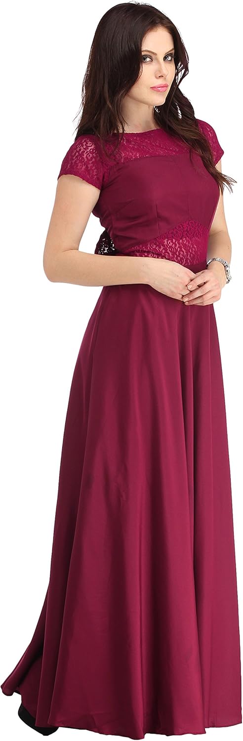 The brand color of the product is wine/burgundy that is dark red (maroon) trending towards purple....... This maxi flared dress will give you a perfect look. It has a boat neck and back bow detailing with sheer sexy effect. Designed for a perfect fit and flowy flare to be worn confidently along-with a pair of sexy black heels, and black clutch.